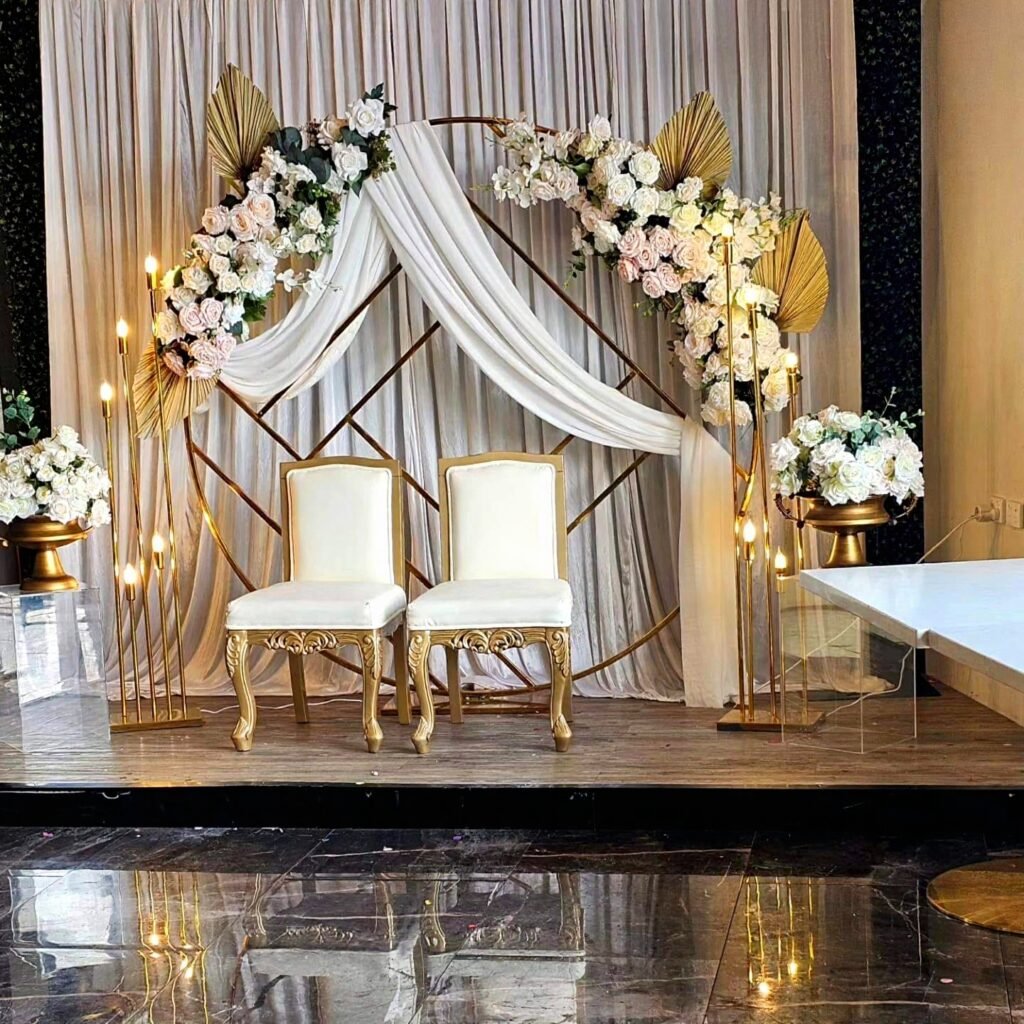The wedding stage is one of the most photographed areas of your celebration. Elegant wedding stage decoration ideas include draped backdrops, floral walls, custom name signage, LED lighting, and premium seating arrangements.